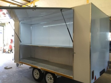Custom built with fold down stage, a storage compartment in the front and any added extras.